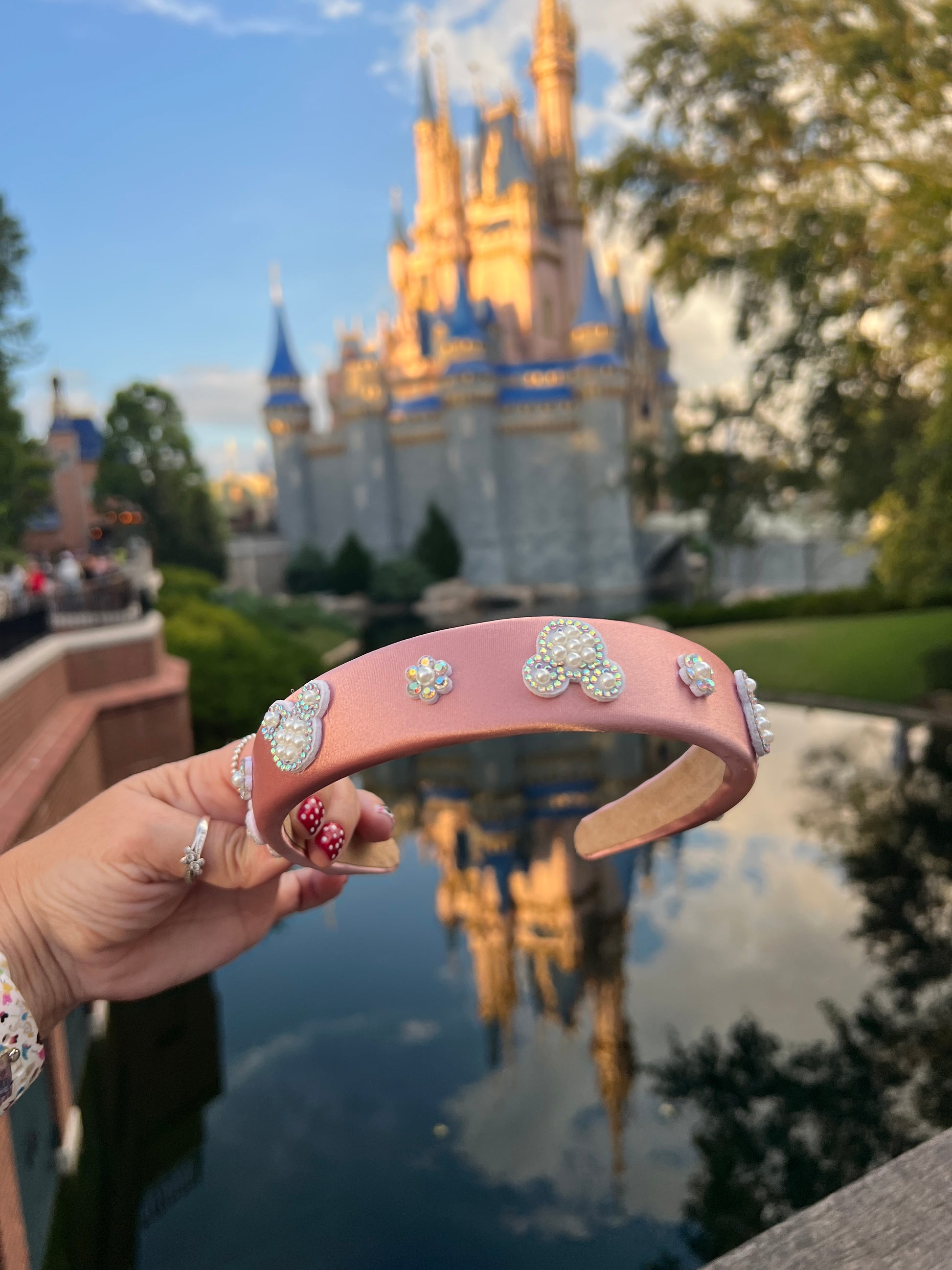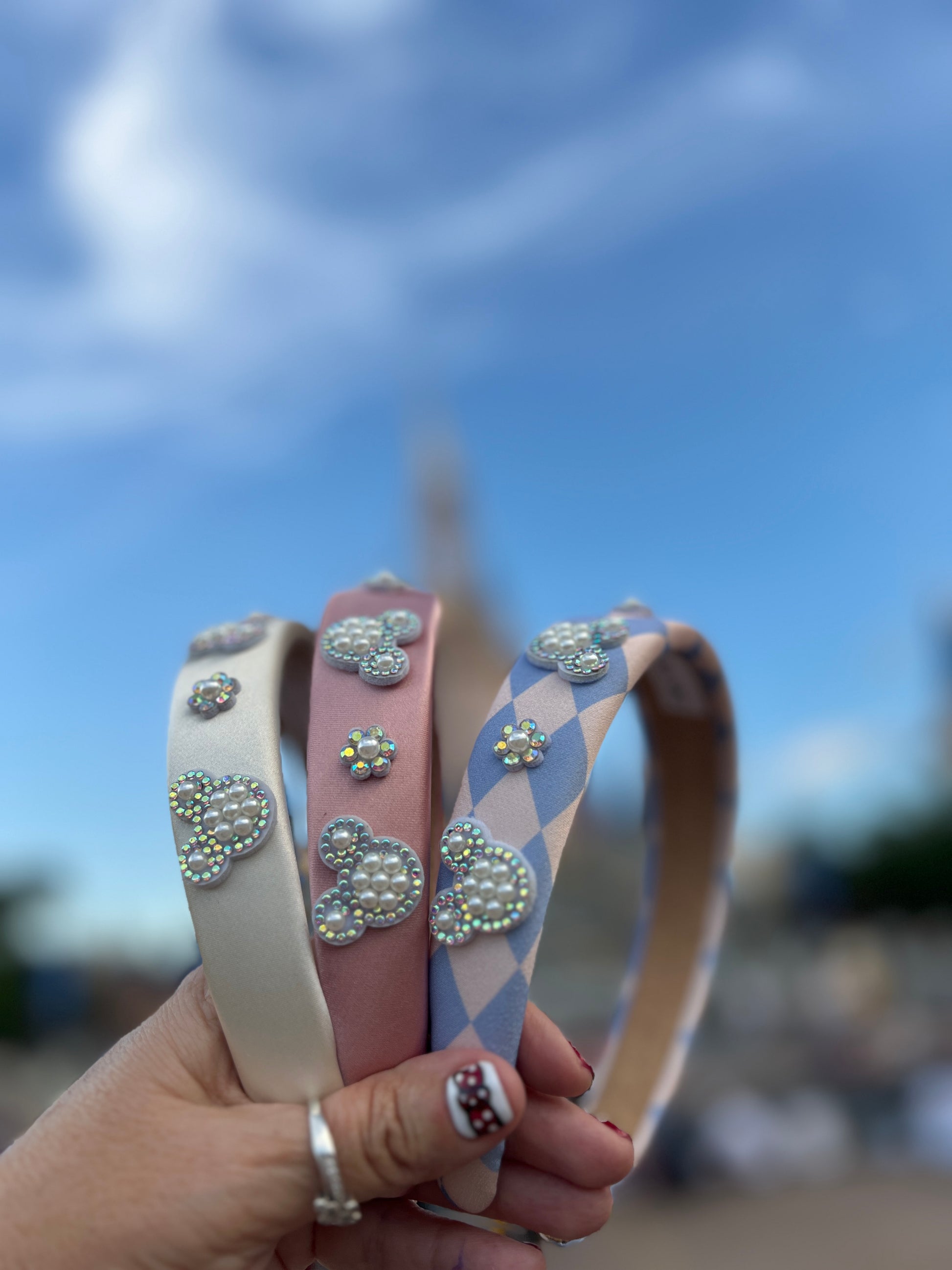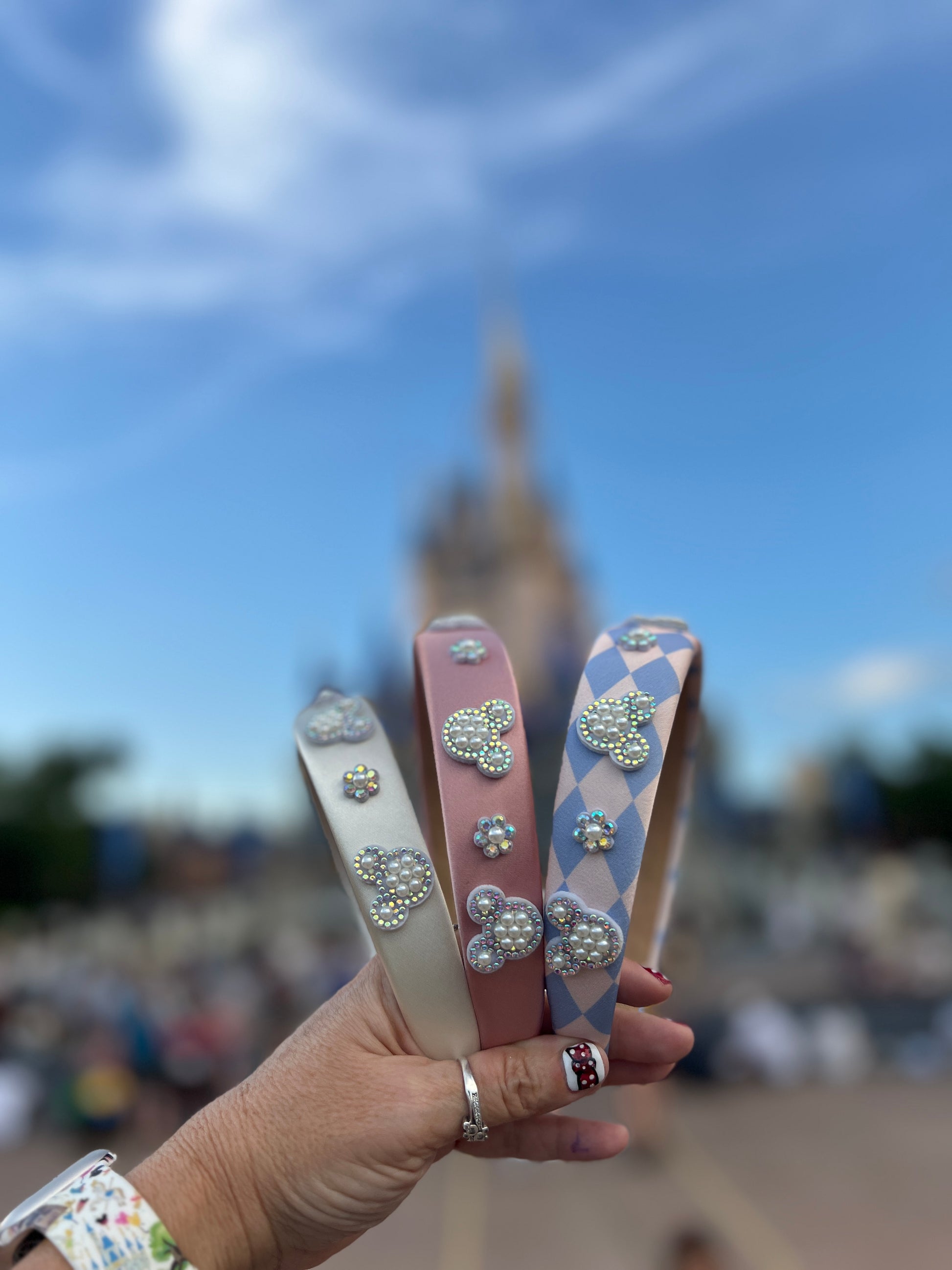 1” Mickey comfort headbands. Covered in Pearl and Diamond Mickey icons.