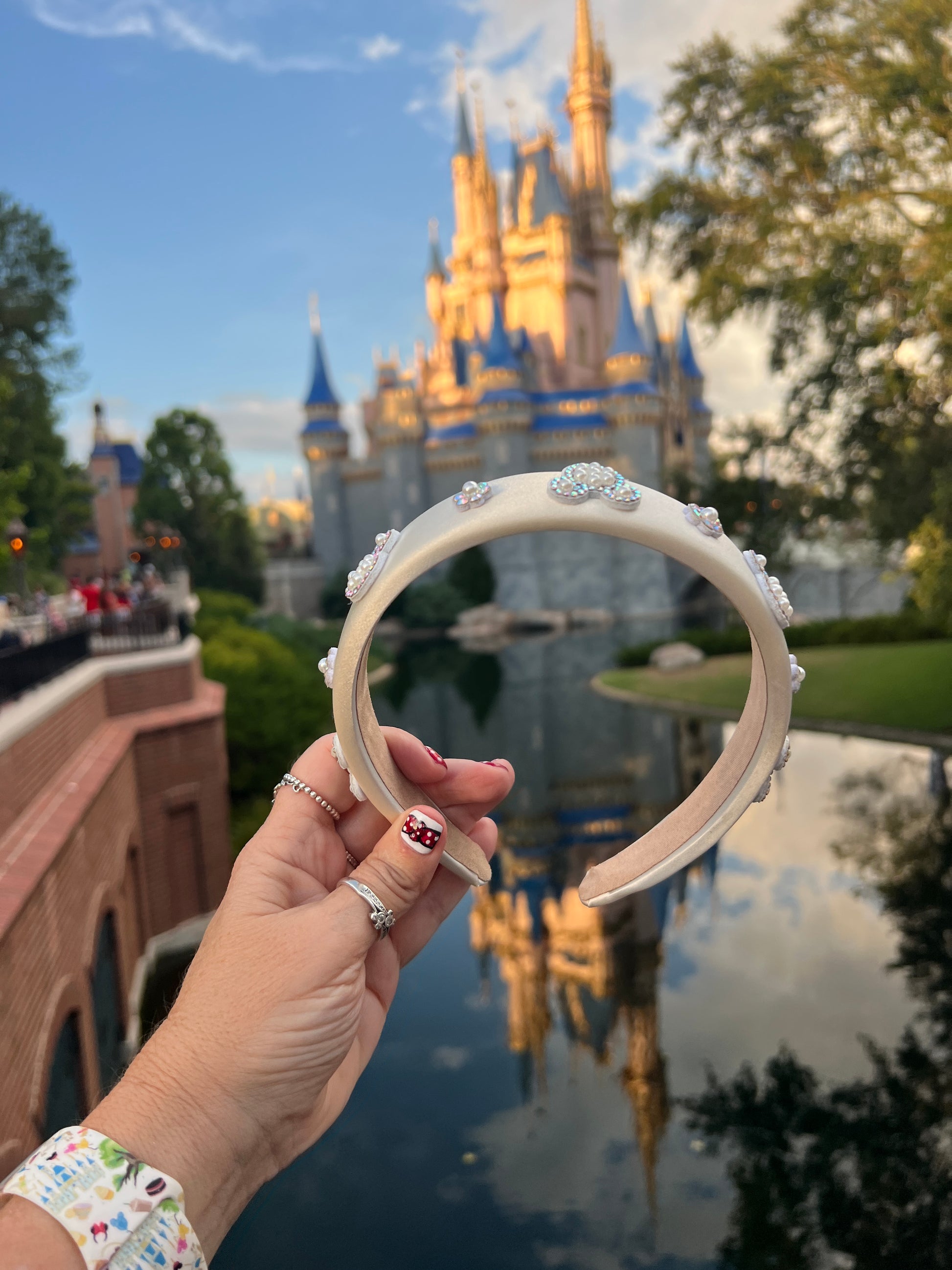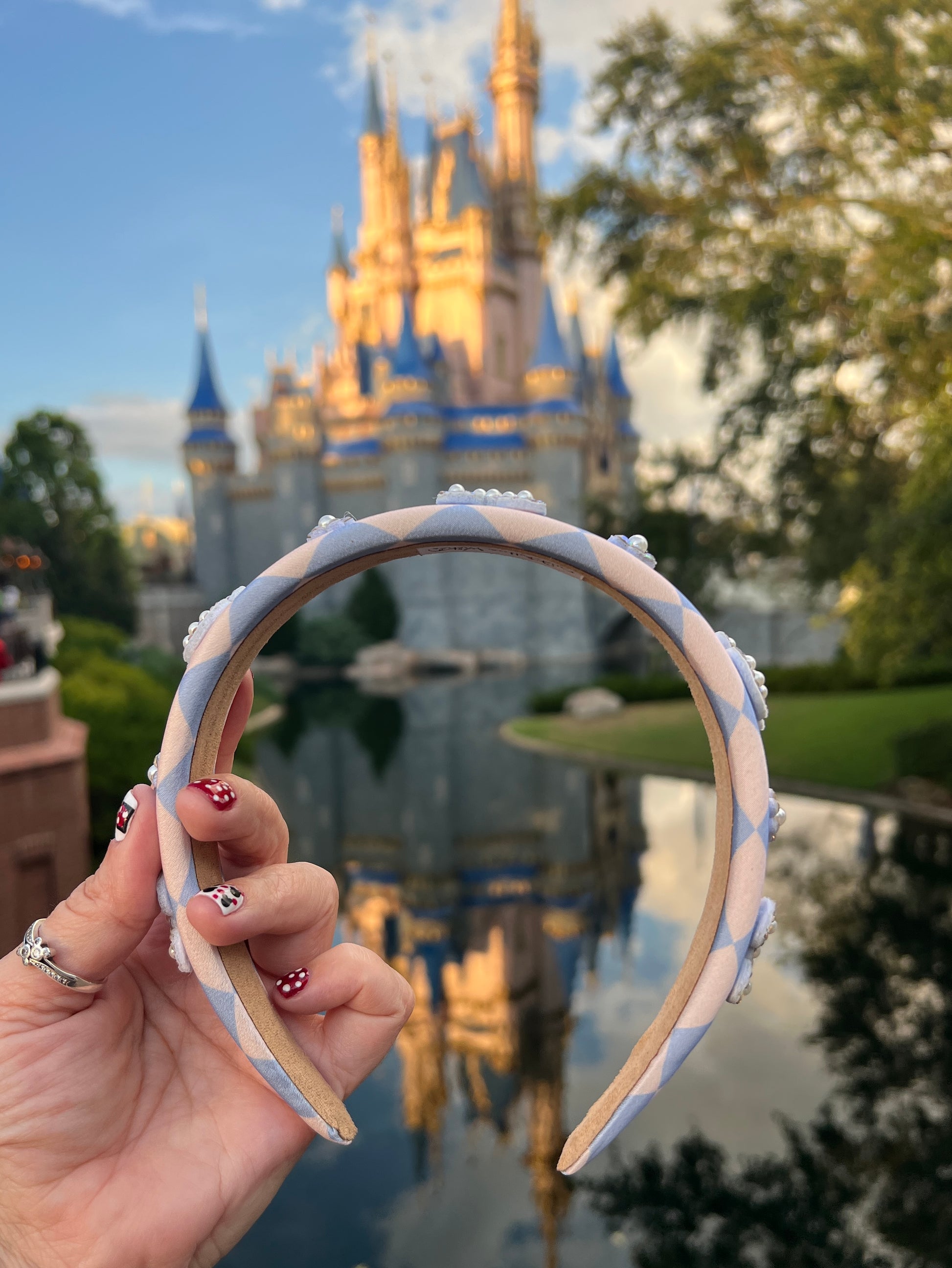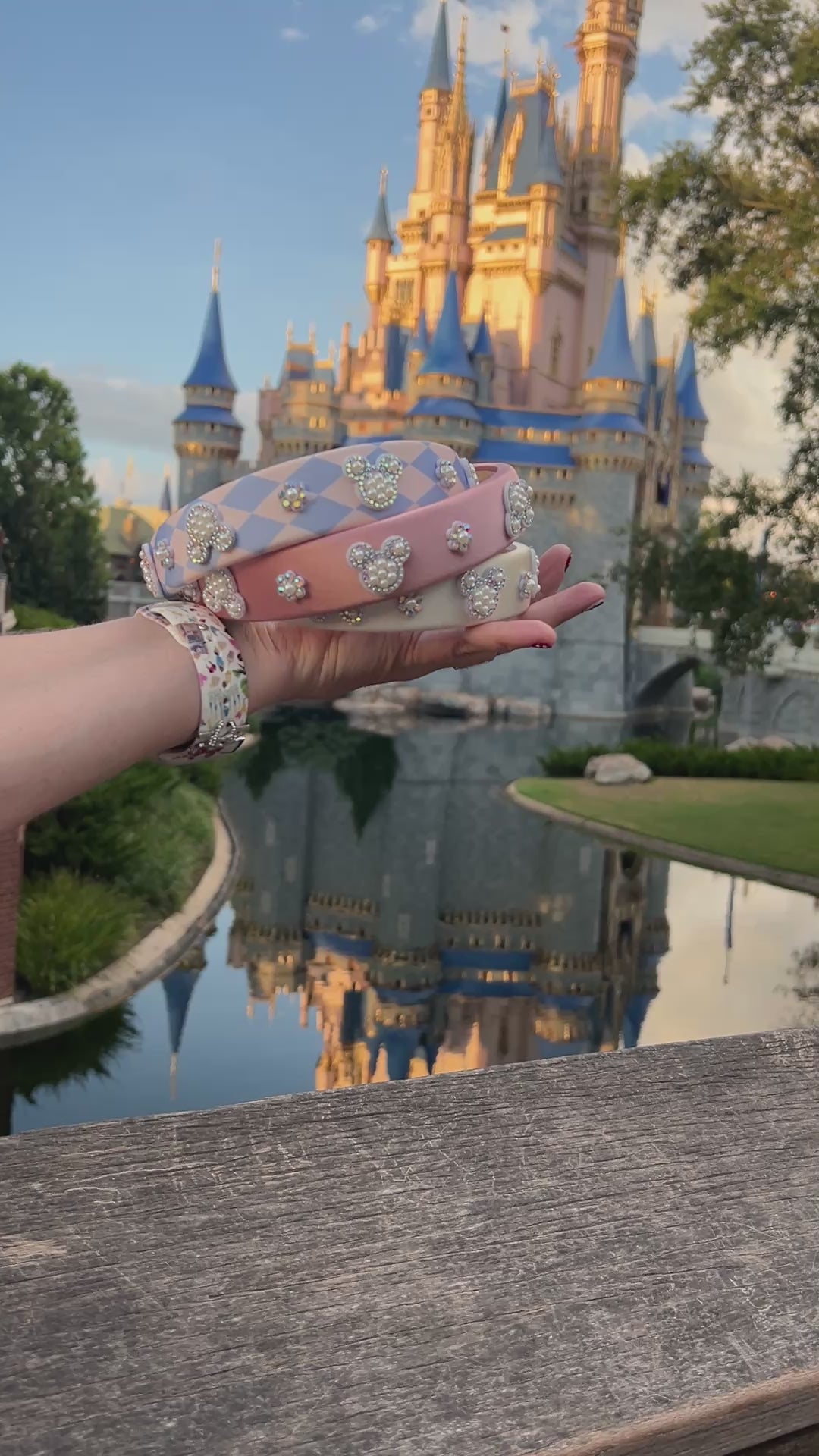 1” Mickey comfort headbands. Covered in Pearl and Diamond Mickey icons.