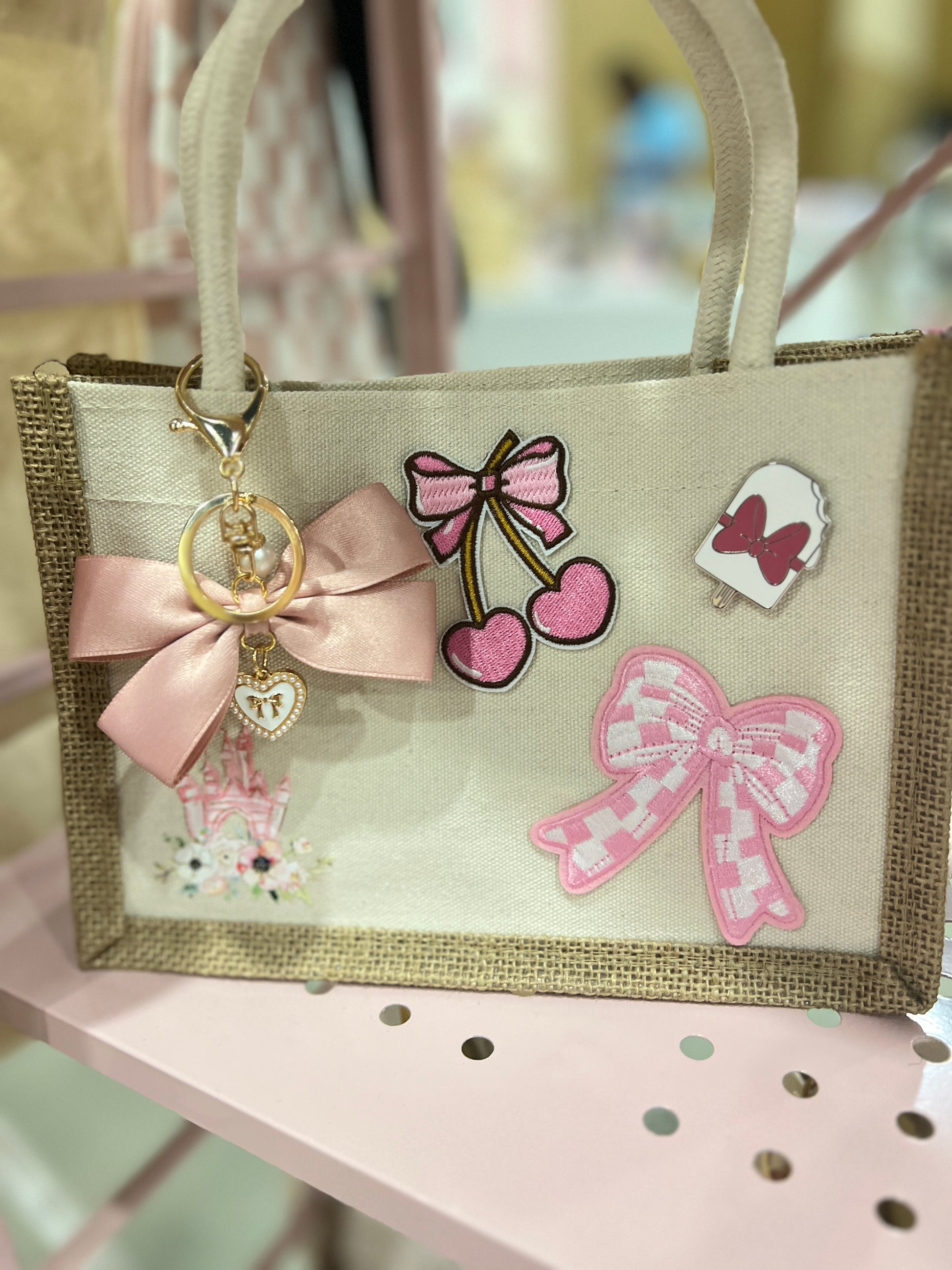 Add your own name or initials to your small Canvas tote bag with patches and key ring dangle