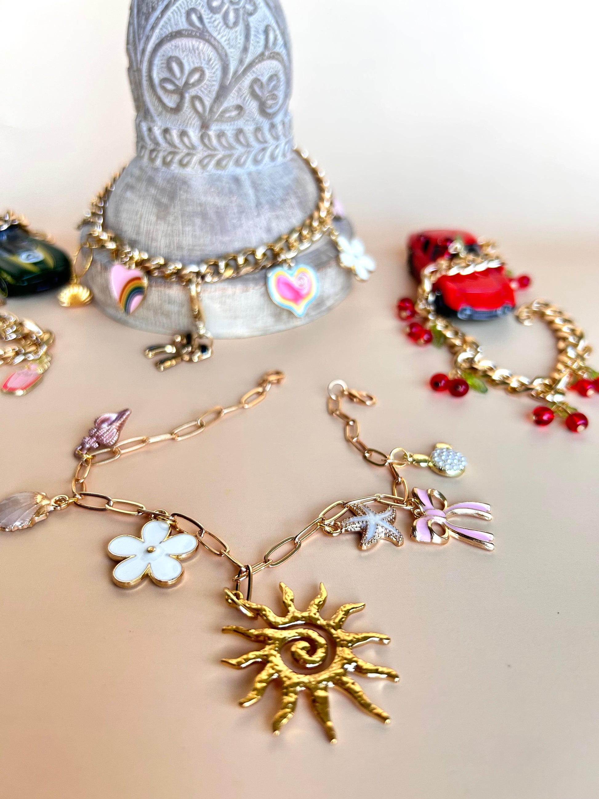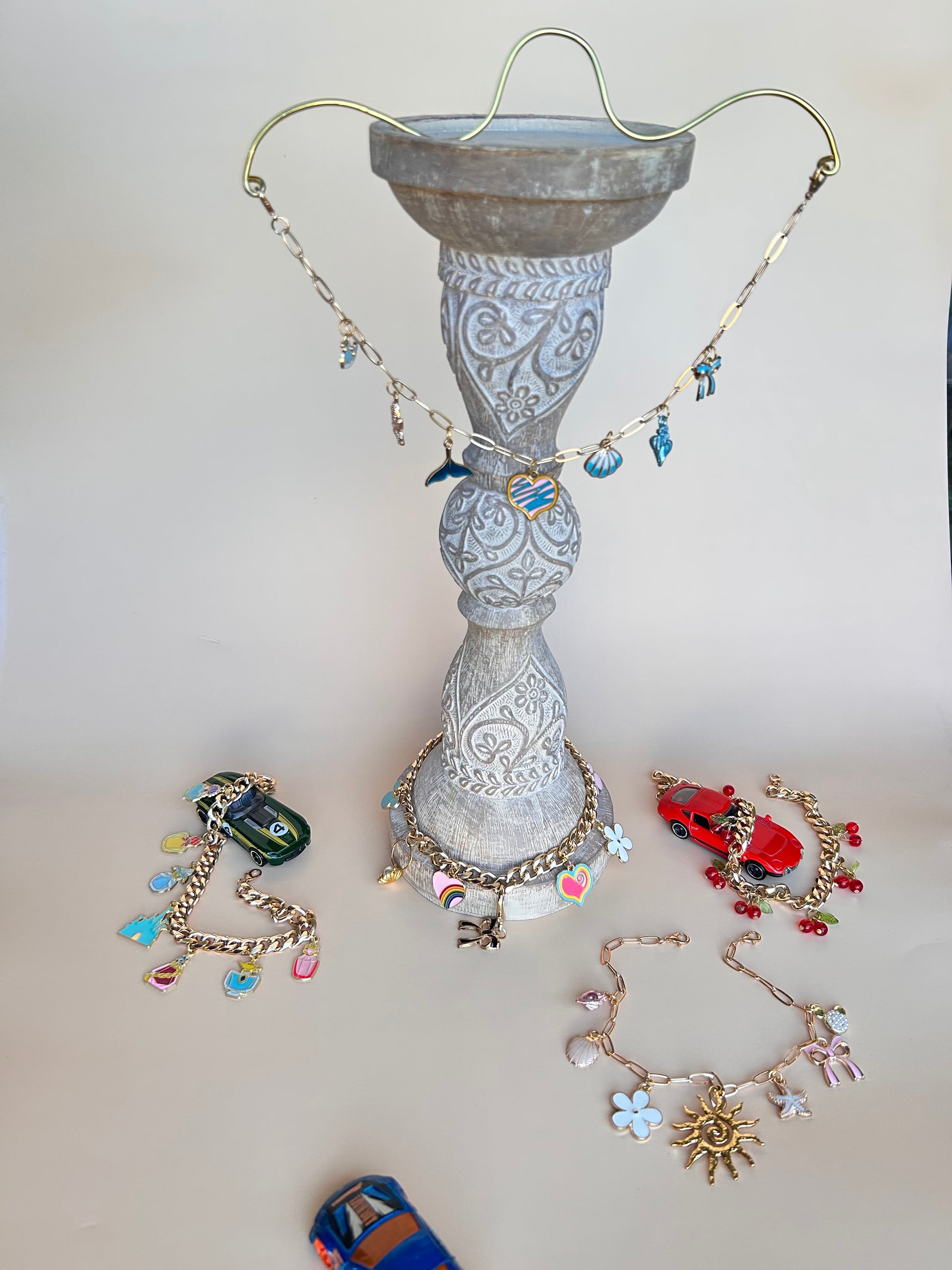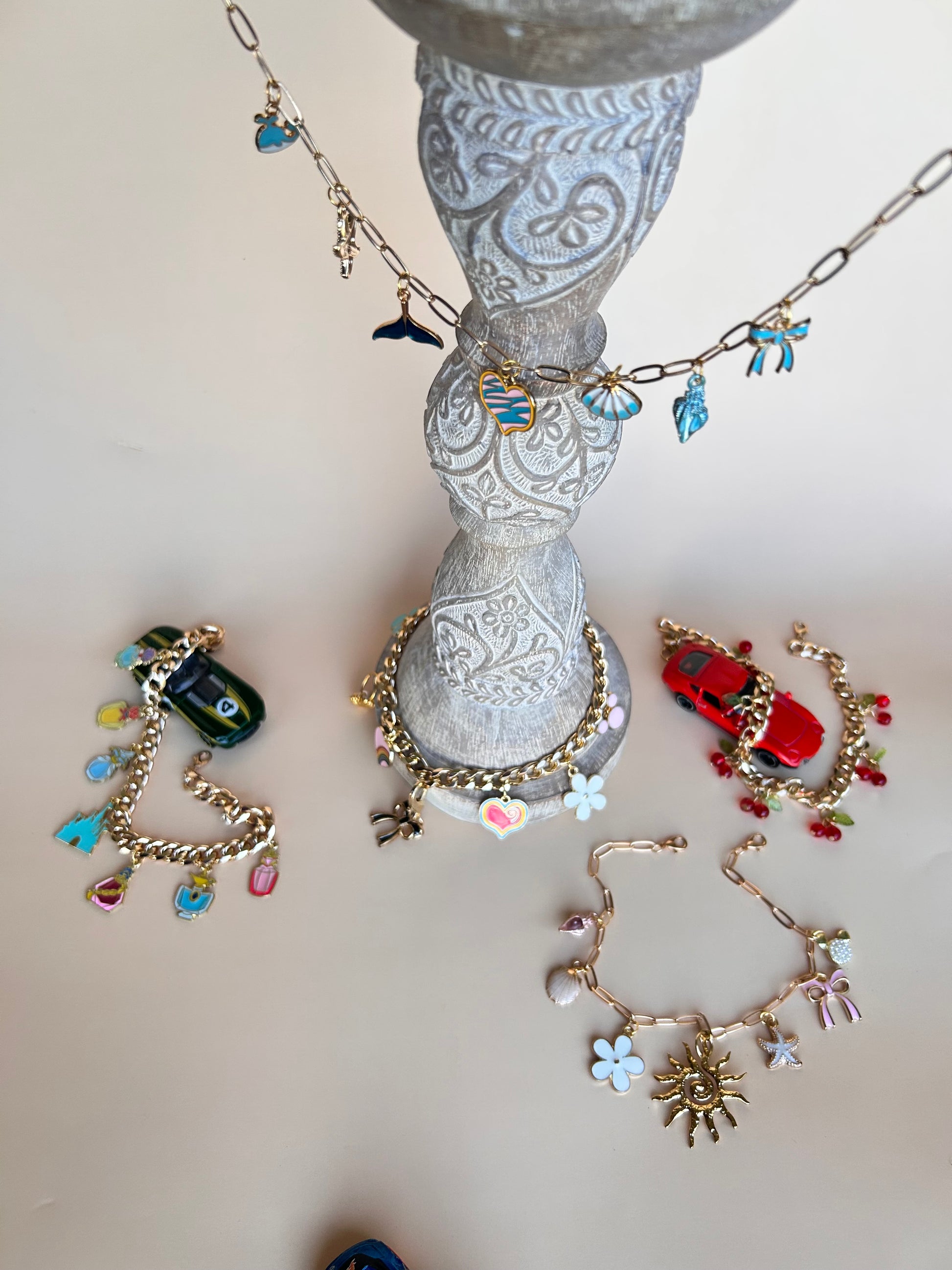 Spice up your vehicle with this gorgeous charm bracelet that goes over your review mirror. Miscellaneous charms on each one but if you know which specific charms you would like please leave me a note and I will make sure your review mirror charm is exactly what you want.