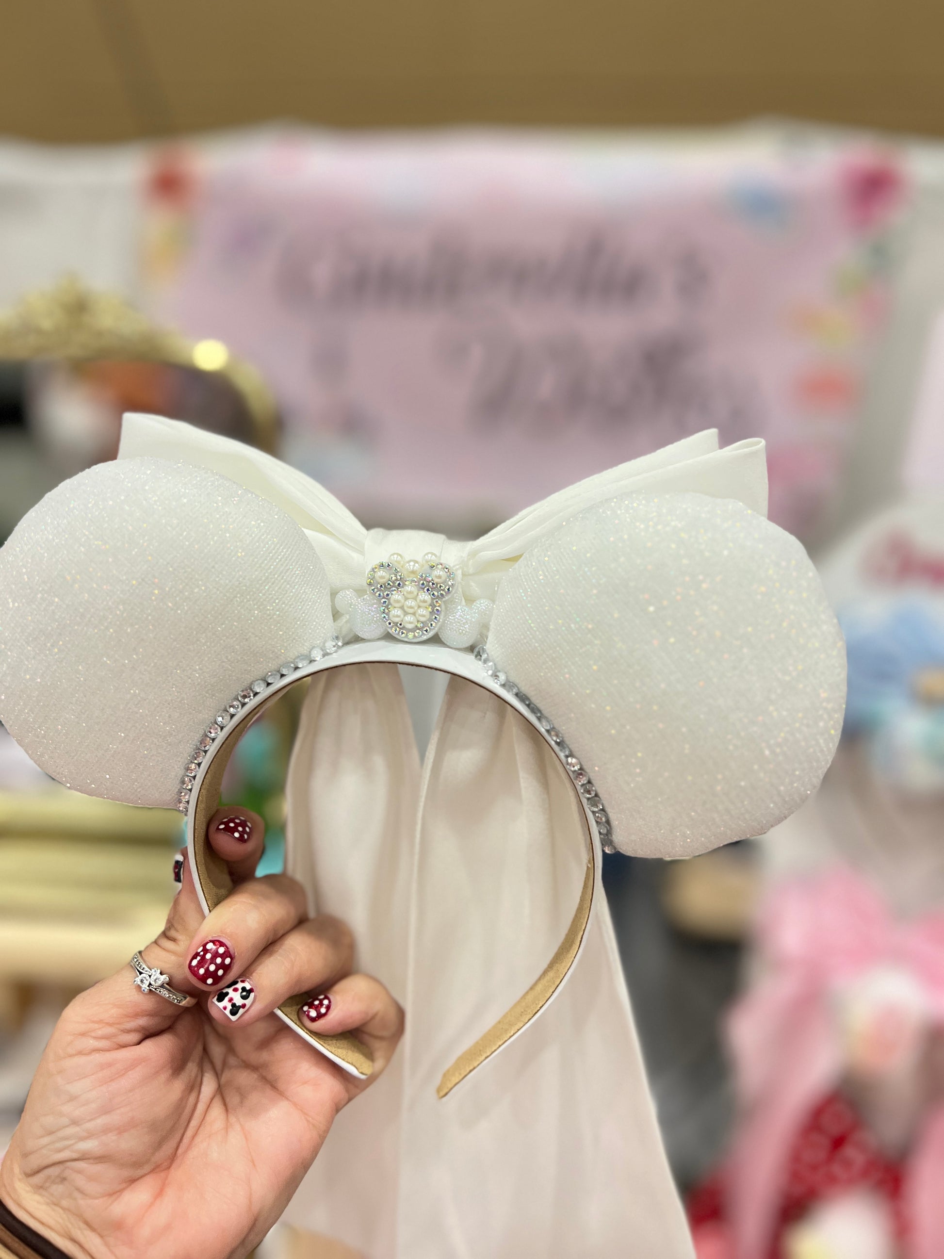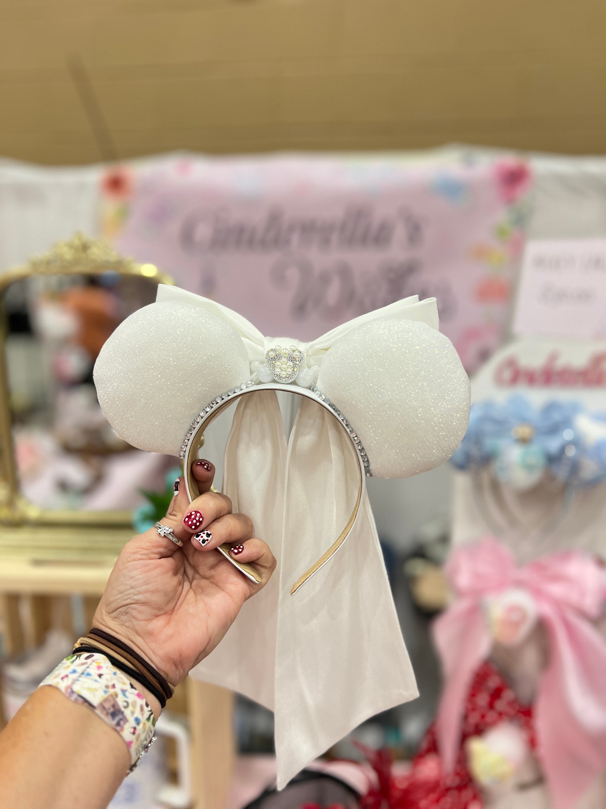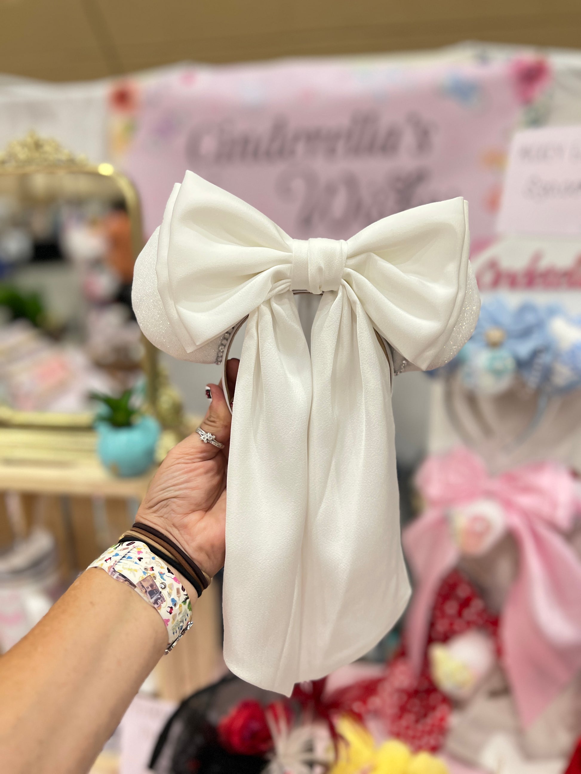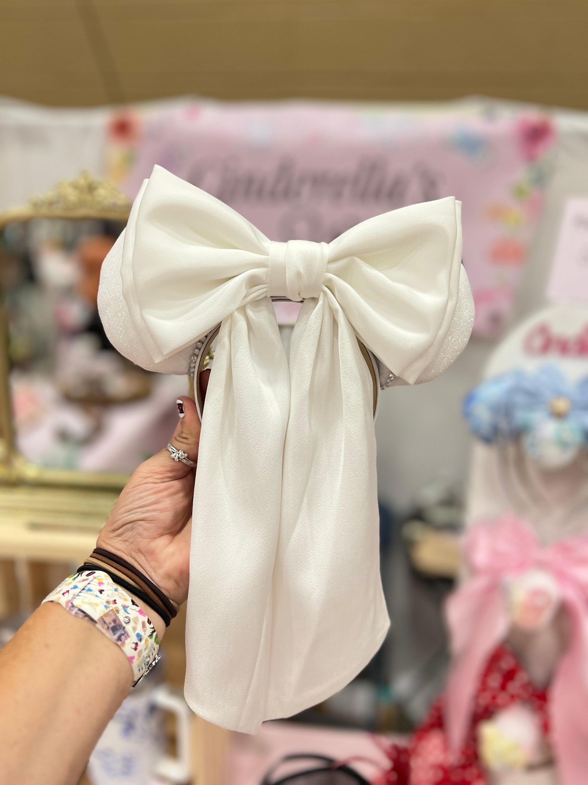 White Wedding ears …Beautiful silky bow! Add diamond or pearl Mickey beads to the bow